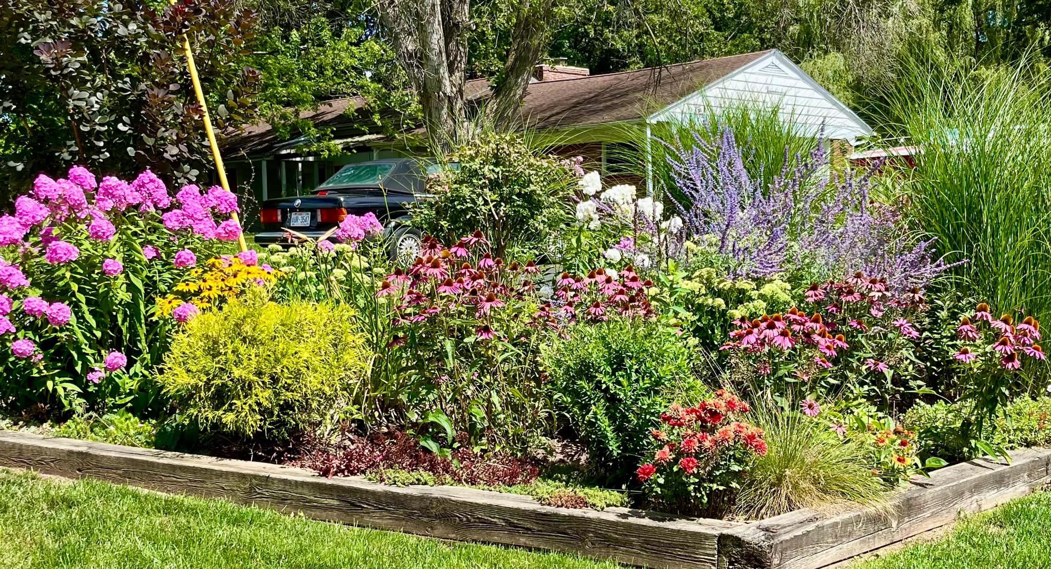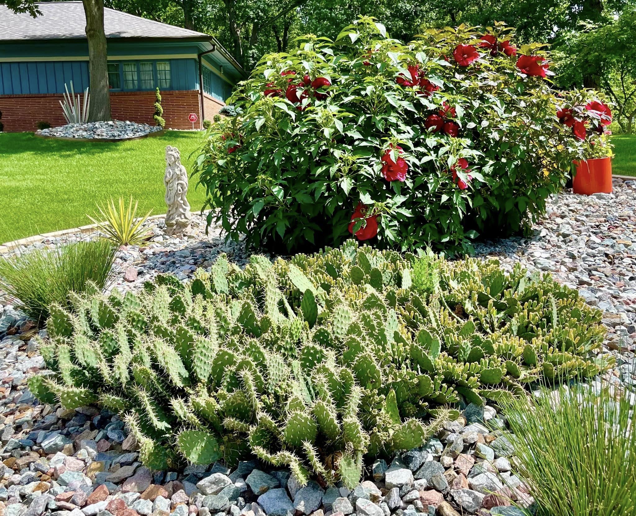 Our second Garden of the Month for August is the work of Mike Bouchard at 2619 Oakwood Ave., and yes indeed, that’s cacti you see. Prickly pear cactus is a native Wisconsin plant, and we love that the unique low grower shares a bed with the big, showy blooms of the hardy hibiscus.