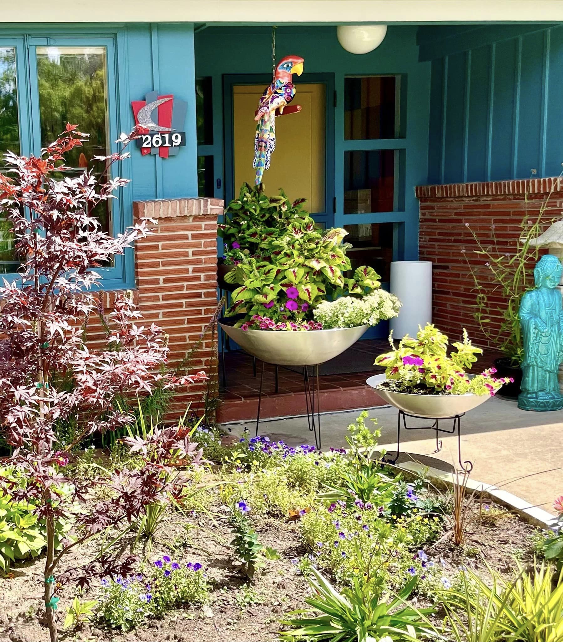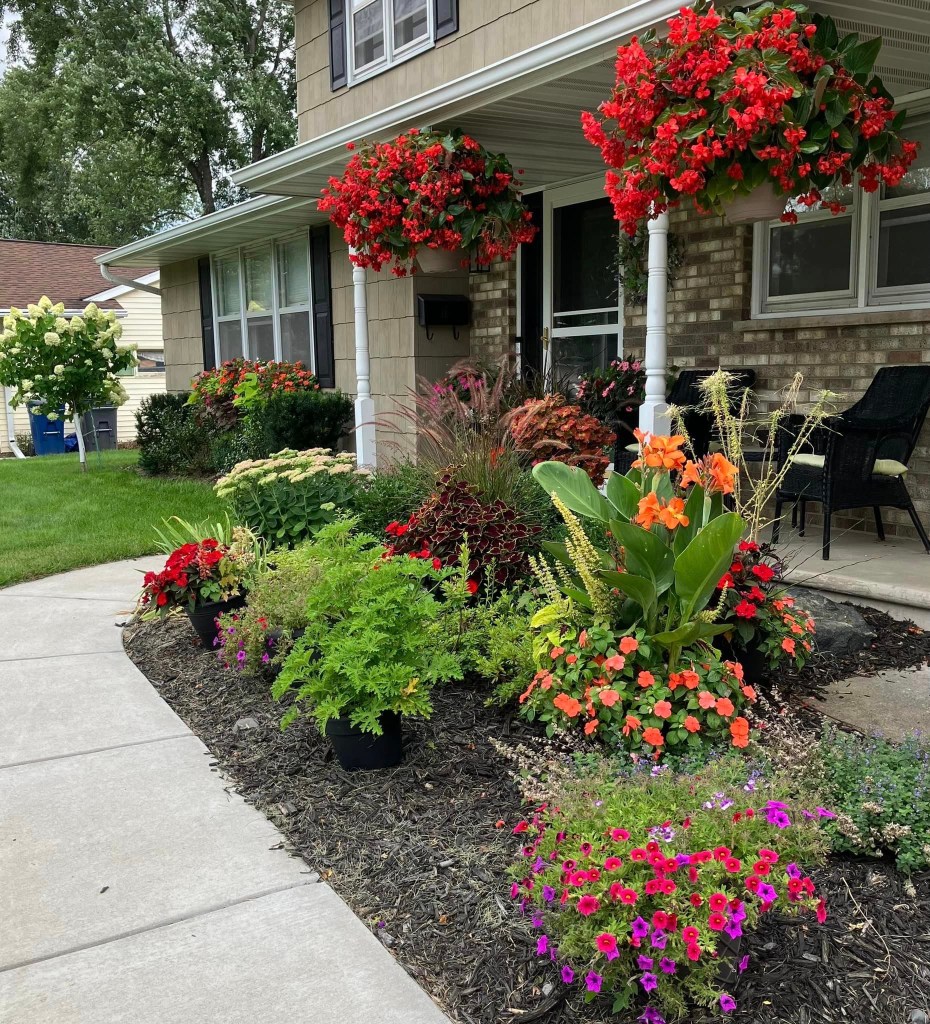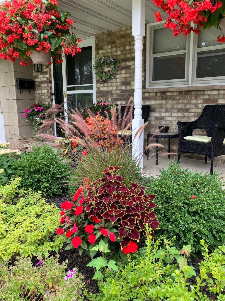 Our first stop is the home of Adam and Jamie McVey at 606 E. Briar Lane. They’ve lived there for four years and are still adding more perennials, but it’s Jamie’s eye for annuals in vibrant colors that makes their yard stand out. From those two big (and we mean BIG) hanging baskets on the porch that runneth over with Dragon Wing begonia blooms to the matching sets of planters that frame the front door and the garage, everything is bold, beautiful and balanced.