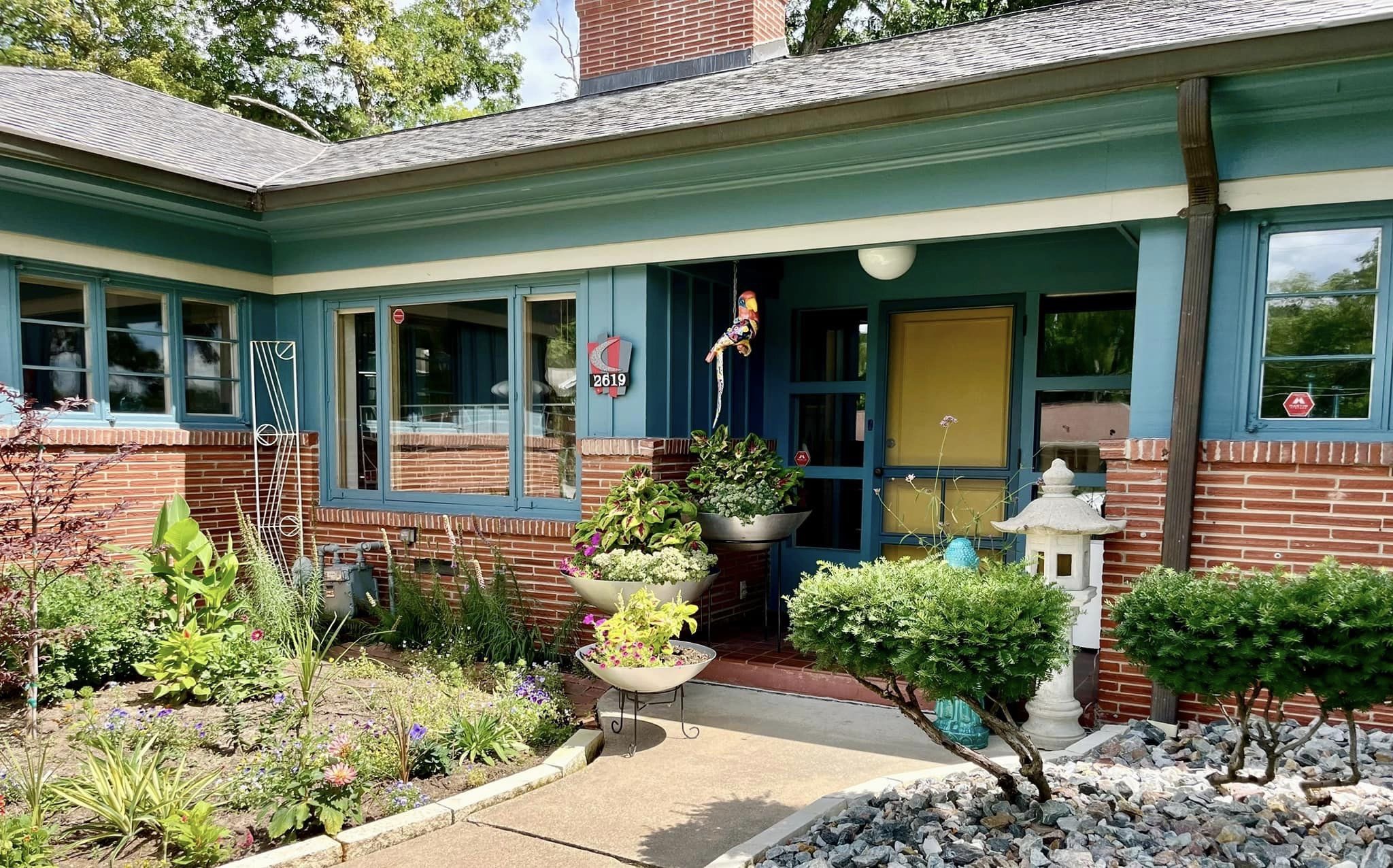 Since purchasing the house in 2020, he has been busy renovating inside and out, including the garden spaces. Ornamental grasses, both in tall, dramatic planters by the front steps and in the ground, swaths of black-eyed Susan, a “Strawberry Sundae” hydrangea, a dwarf Japanese maple and hostas make for a welcoming yard. A newly planted cherry tree is in remembrance of his father.