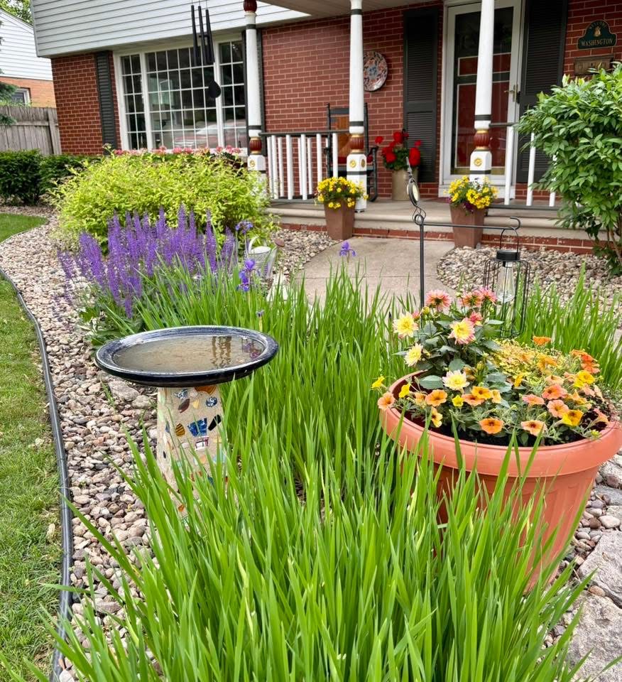 Linda originally lived in the house when it was first built from 1989 to 1993 and returned to it with Jeff in 2020. They wasted little time in transforming the front yard, which included just two trees, with inviting landscaping. They added plantings to both the front and side yards and replaced the deck with a patio. Their yard is also a welcoming space for birds with plentiful feeders.