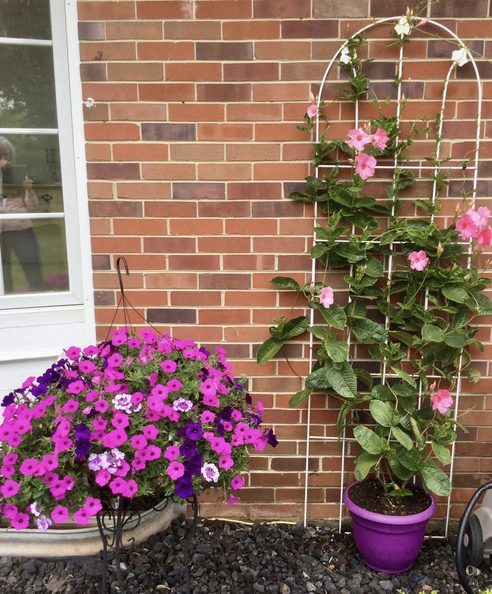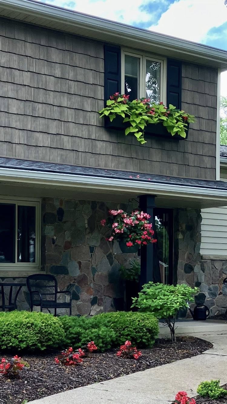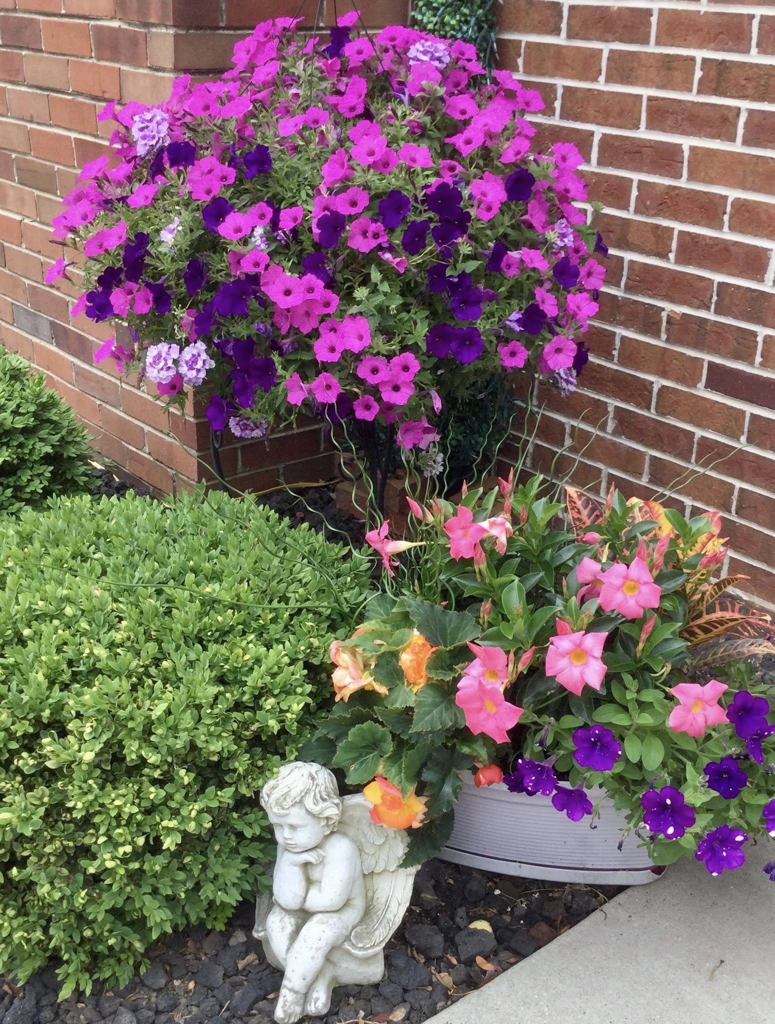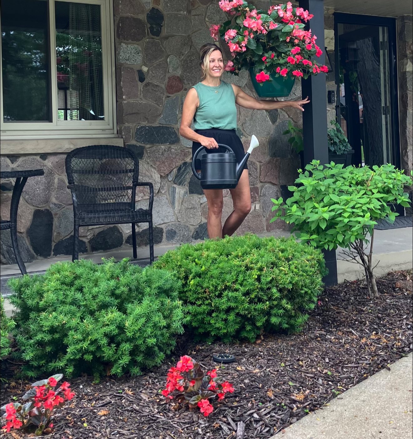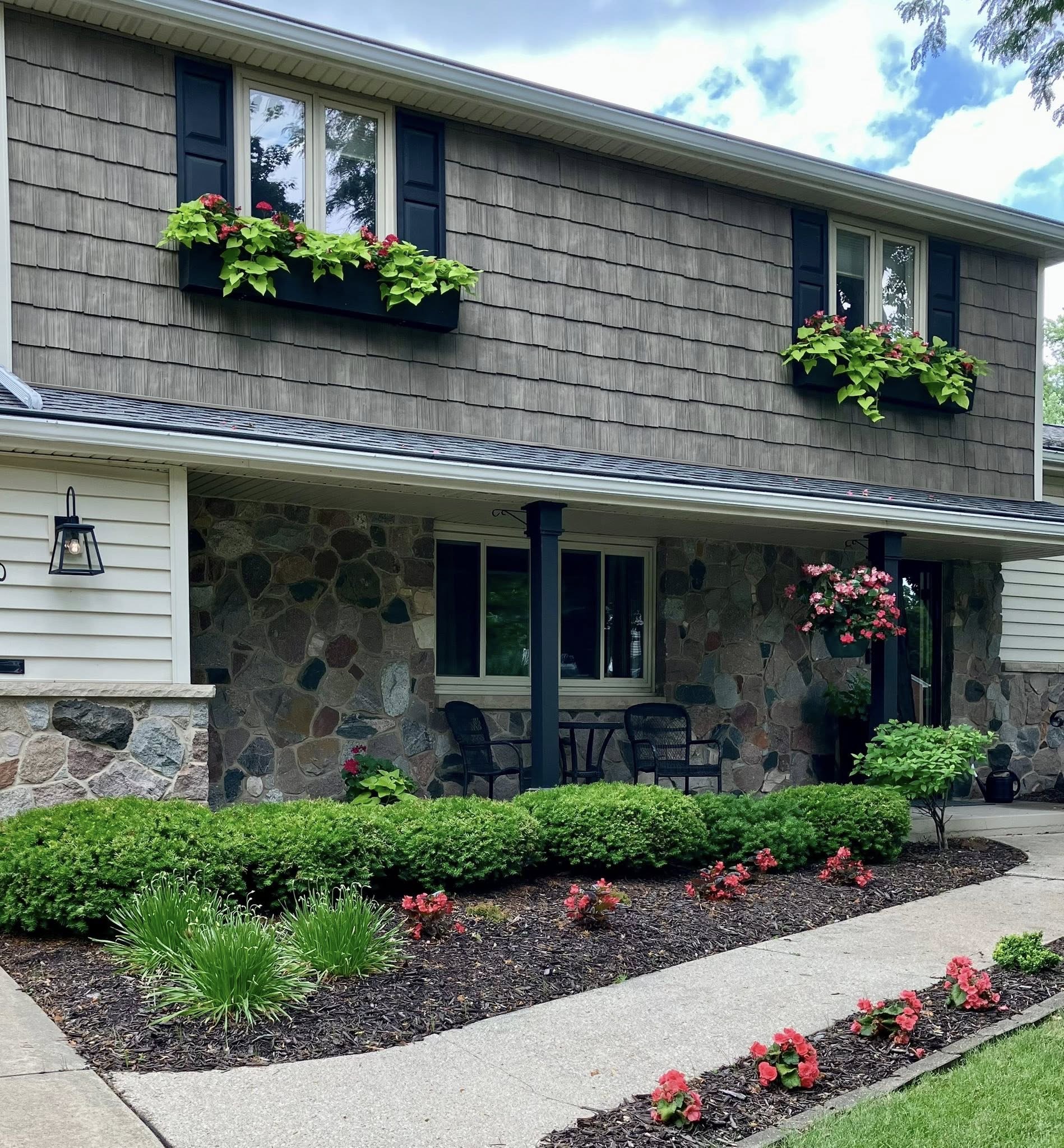 Her flower color scheme of choice — reds and pinks — is repeated in window boxes, a hanging basket and ground plantings. Such a tasteful display, and those begonias and impatiens sure do pop against the lush green of the shrubs, the manicured lawn and the sweet potato vines. It’s both deceptively simple and impeccably done.