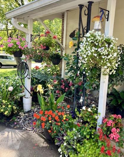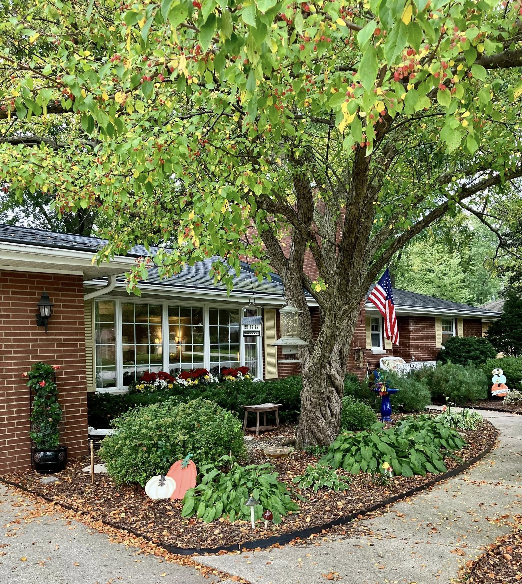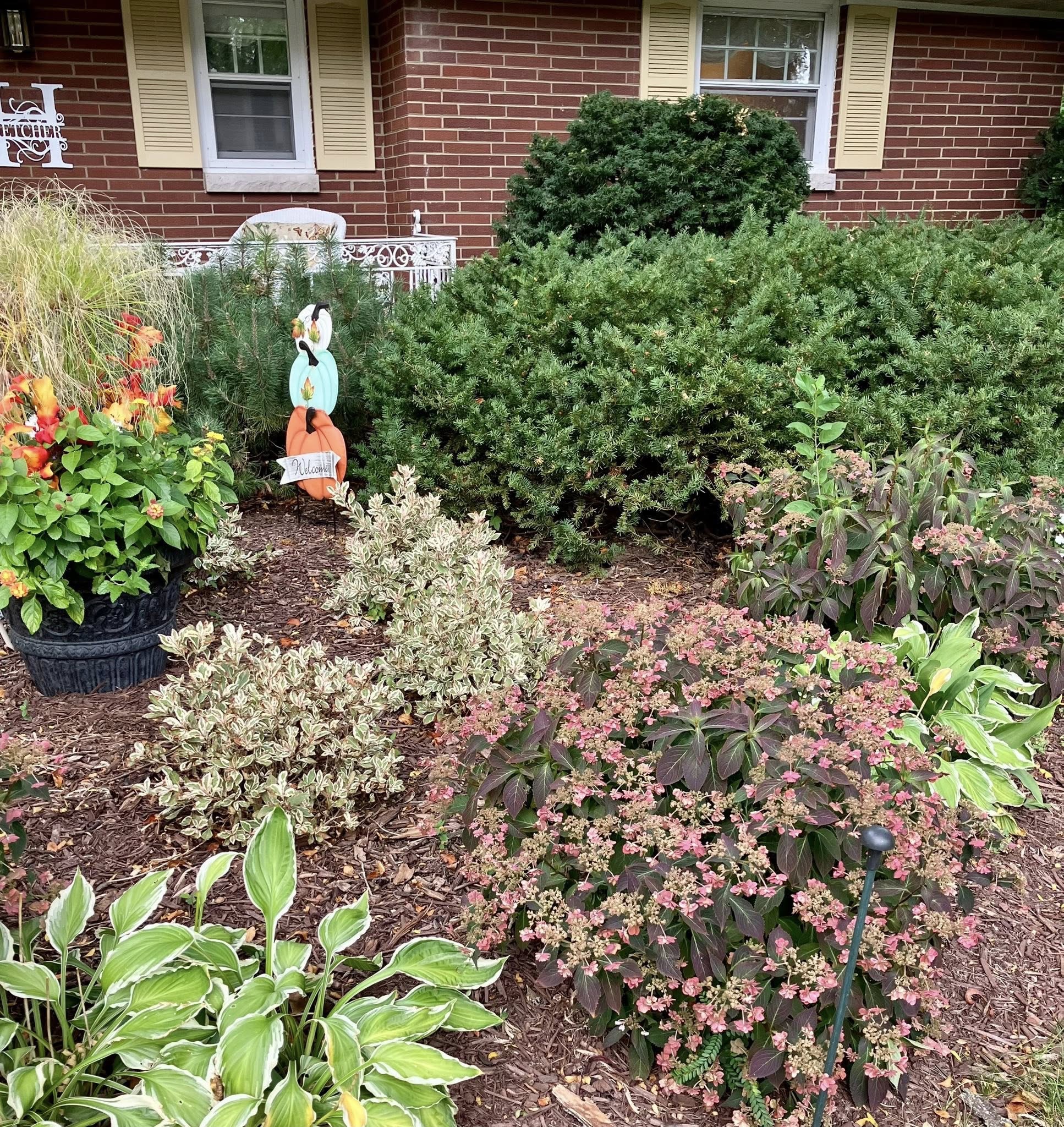 Lynn and Nick Hetcher’s yard at 360 St. Mary’s Boulevard is all cozy fall vibes with the colors of the season, the muted hues of maturing hydrangeas and an early sprinkling of fallen leaves, while geraniums, marigolds and other annuals keep the summer bolds and brights coming.