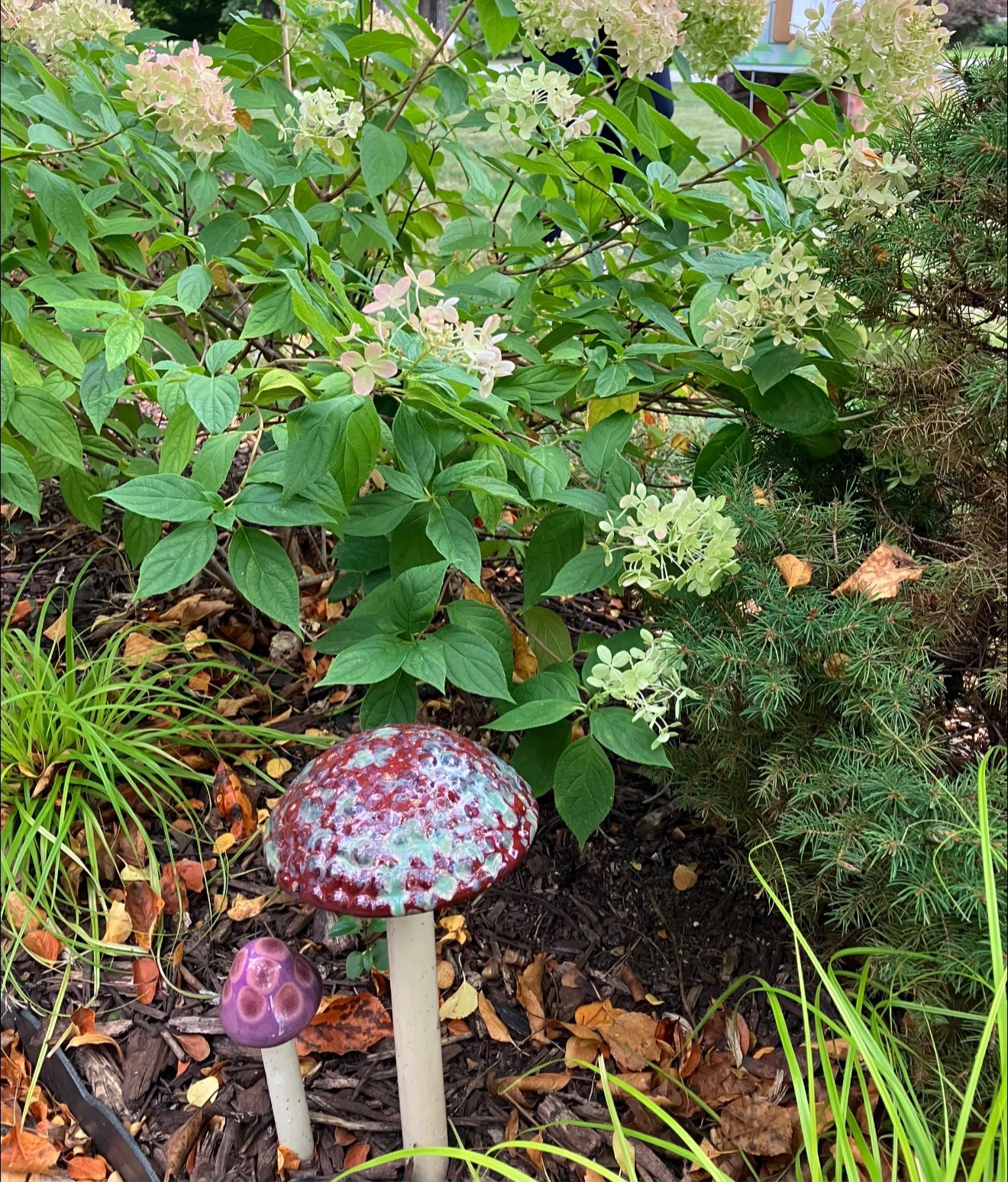 Garden art tucked in here and there includes a life-sized egret and whimsical ceramic mushrooms purchased from a Door County artist each year to commemorate their anniversary.