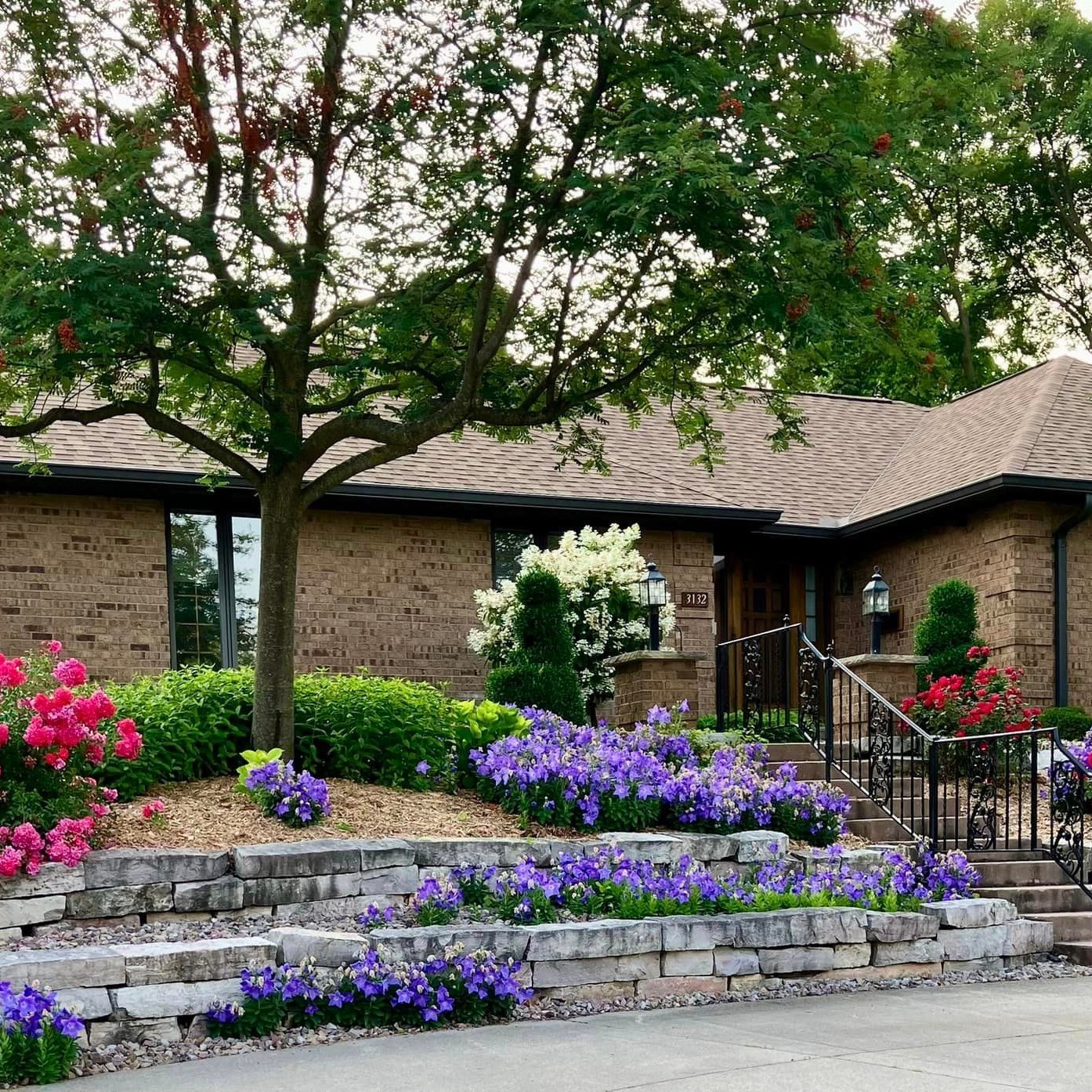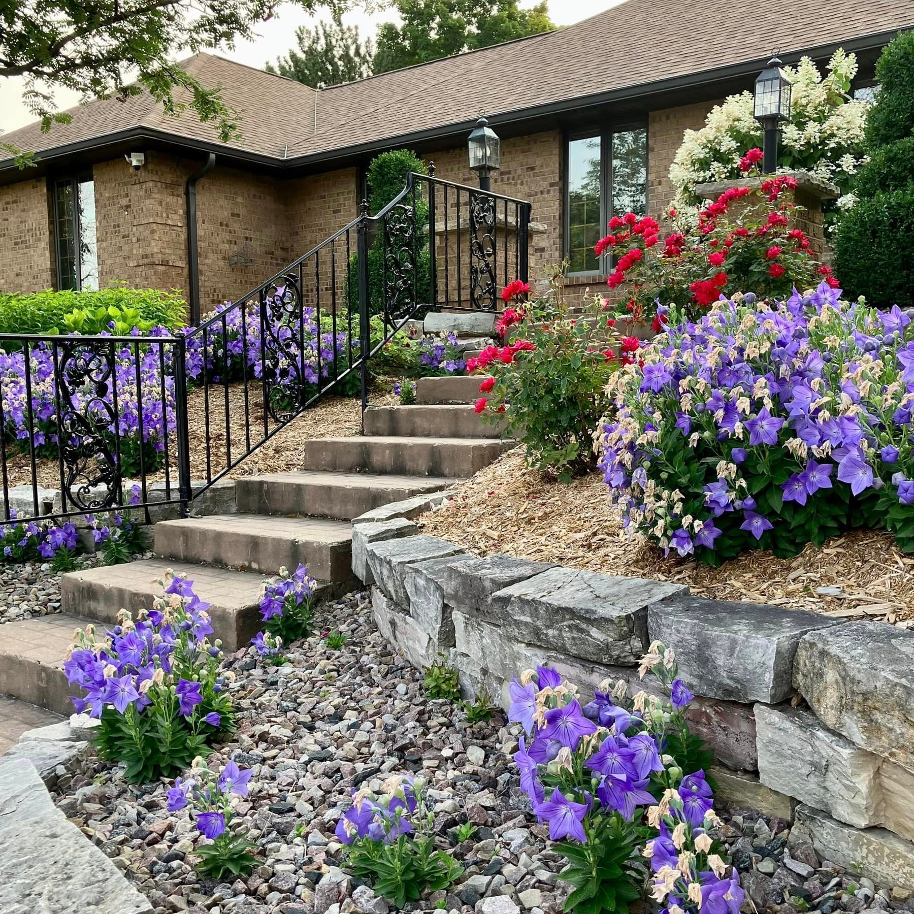 When our July Garden of the Month winners bought their house on Ravine Way some 20 years ago, they learned that hillside wasn’t the easiest to mow, so they worked with a landscaper to redesign it. The terraced hardscaping gives them a sprawling space to display shrub roses, hydrangeas and all those pretty violet-blue balloon flowers.