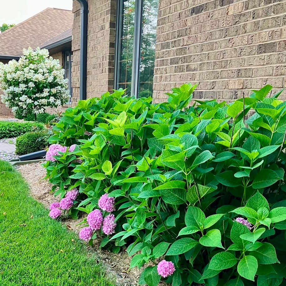 The Whipps, who have lived on Woodview for 11 years, removed the large arborvitaes that once lined the driveway and put in a mix of shrubs, perennials and annuals. Large mixed planter boxes and two pots of coleus that flank the garage door add more color. And can we talk about those “Endless Summer” hydrangeas that are big, fluffy clouds of pink blooms? Wow.